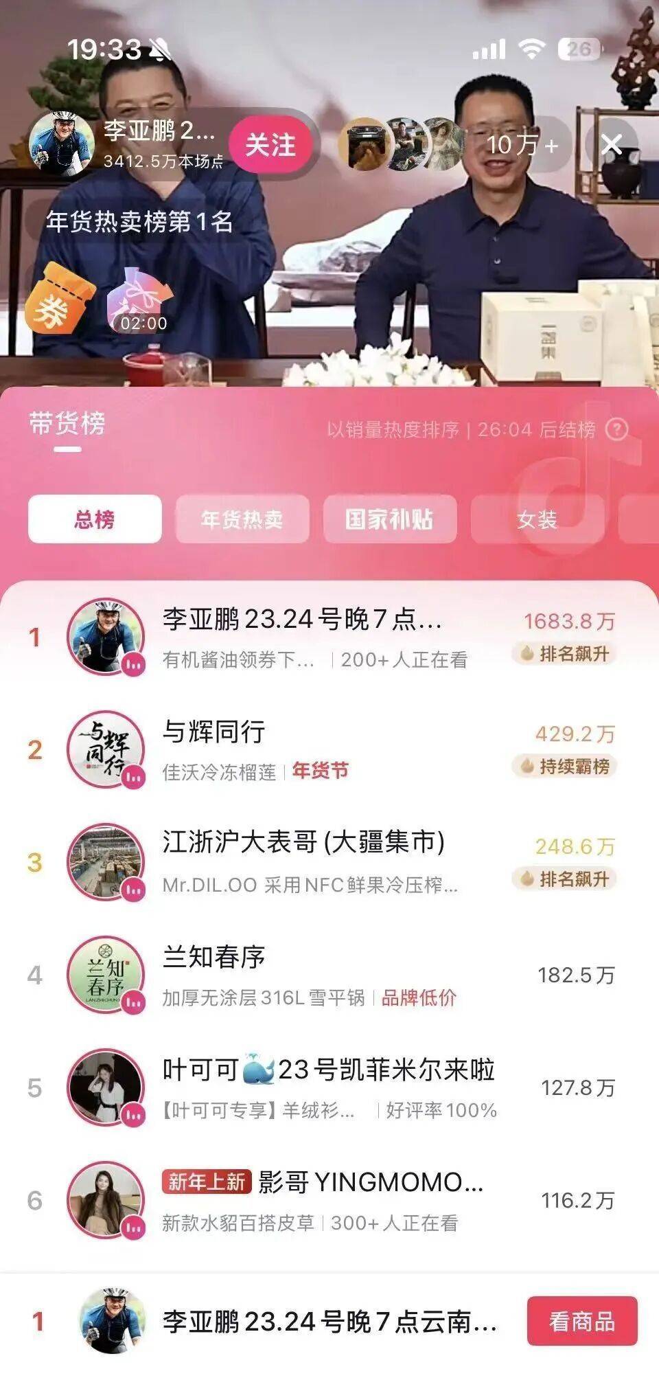 数十万网友涌入,李亚鹏带货90分钟破5000万登总榜第一